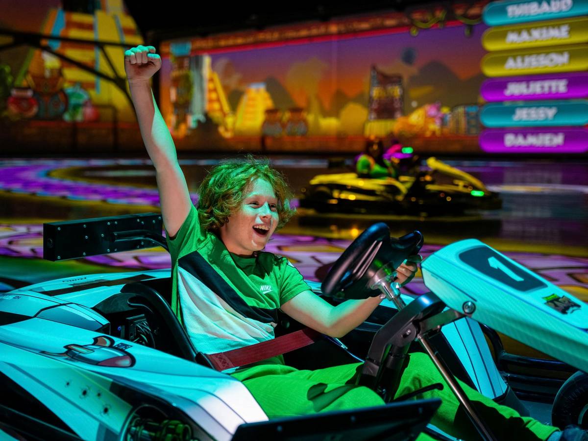 Die Halle bebt. Die Karts schießen los, Reifen quietschen, ein digitales Publikum jubelt von den Wänden. Wer über ein buntes Icon fährt, aktiviert Raketen oder Boosts, die auf dem Boden aufblitzen. Andere Karts werden eingebremst, so als hätte jemand wirklich eine virtuelle Banane geworfen. Es ist, als würde man mitten im Videospiel sitzen. Nur dass man hier wirklich Gas gibt und das Adrenalin echt ist.
