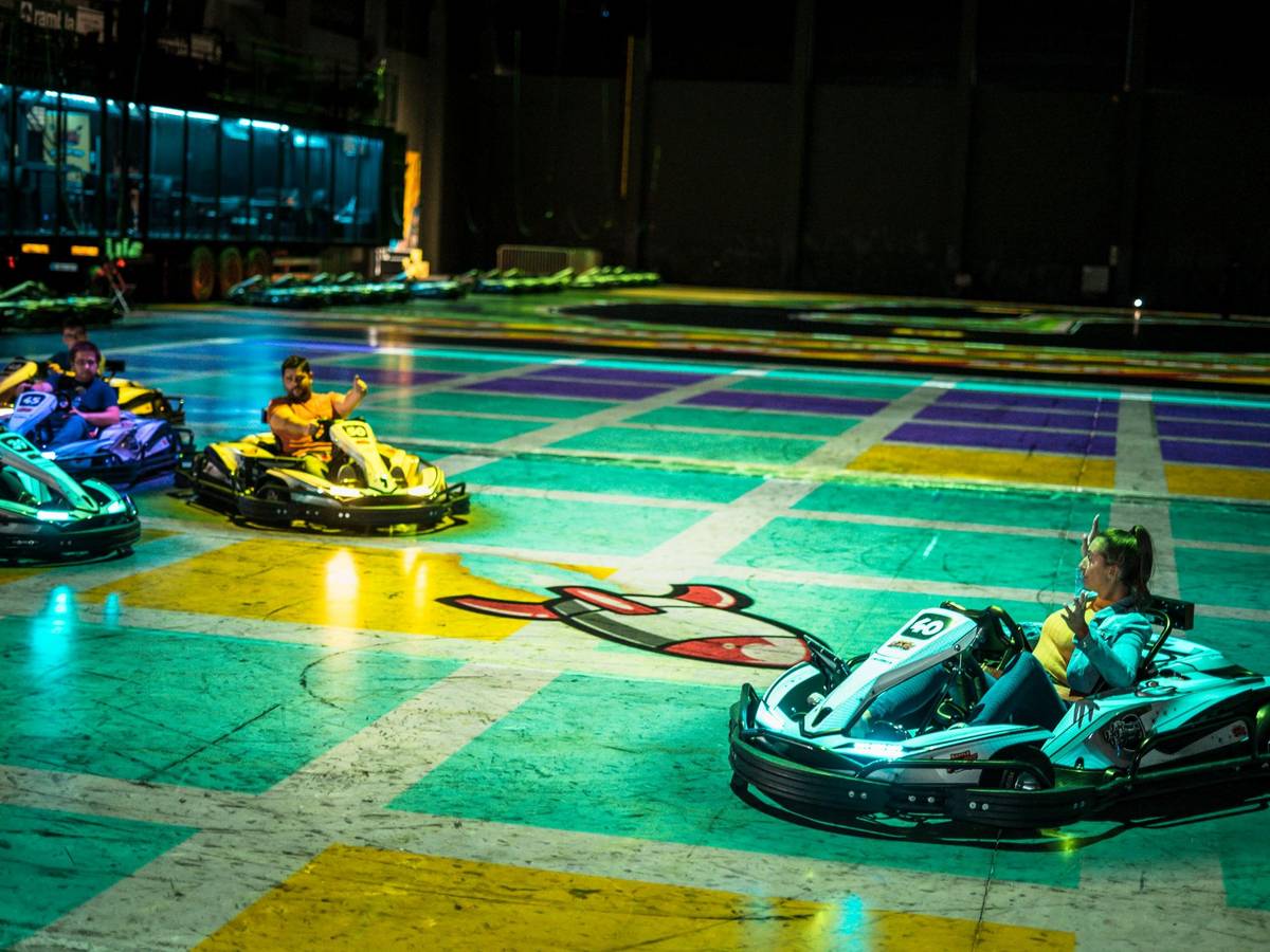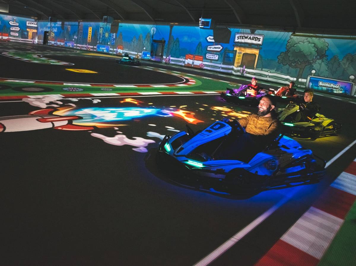 40 Hochleistungsbeamer werfen Strecken, Hindernisse und Items auf den Boden. Die Karts sind elektrisch, geräuscharm und mit Sensoren ausgestattet, die Zusammenstöße verhindern. Sicherheit ist oberstes Gebot, aber der Spaß steht trotzdem an erster Stelle.