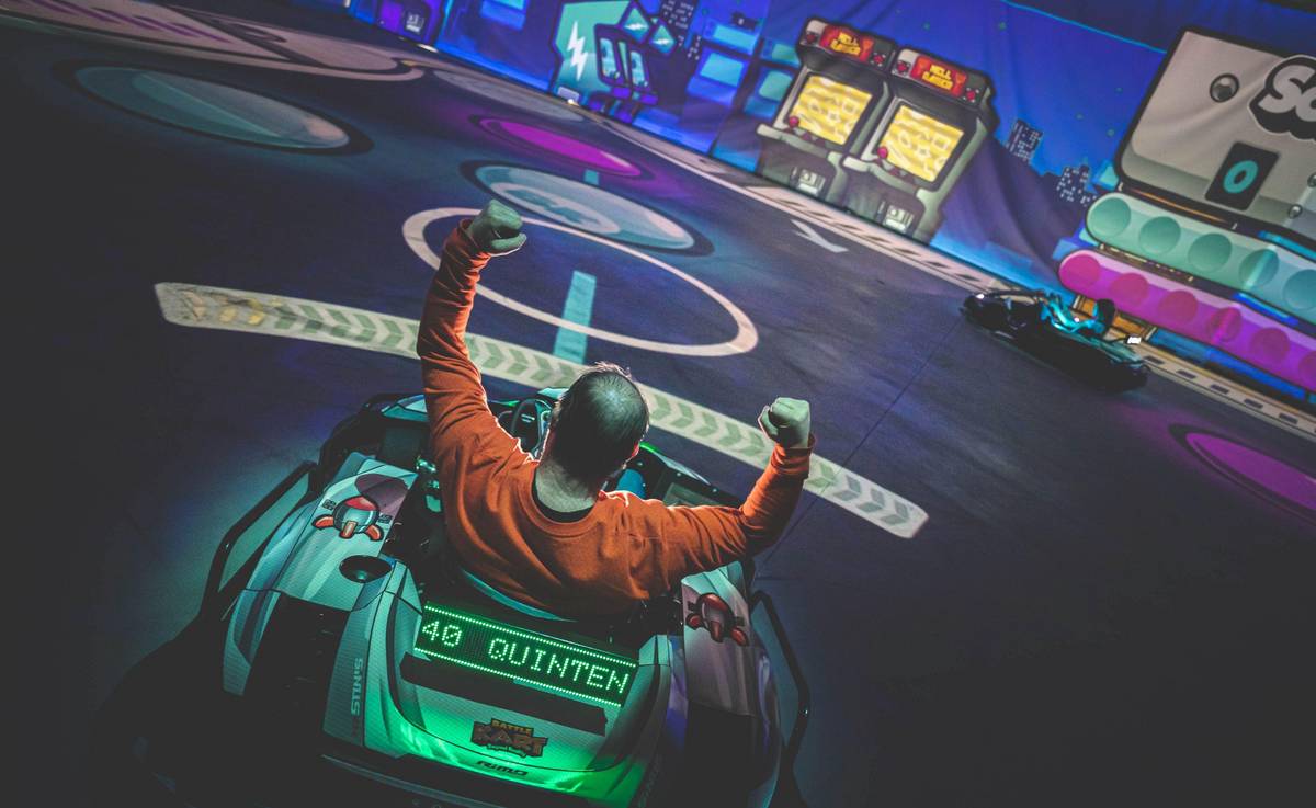 Sechs schwarze Elektro-Karts stehen nebeneinander aufgereiht, auf dem Boden flackert ein digitales Startfeld. Die Fahrerinnen und Fahrer beim Battle Kart schnallen sich an, die Hände umklammern das Lenkrad. Vorne auf dem Asphalt erscheinen plötzlich leuchtende Power-Ups – Symbole, wie man sie aus Videospielen kennt. Eine Stimme aus den Lautsprechern zählt herunter: „Three, two, one – GO!"